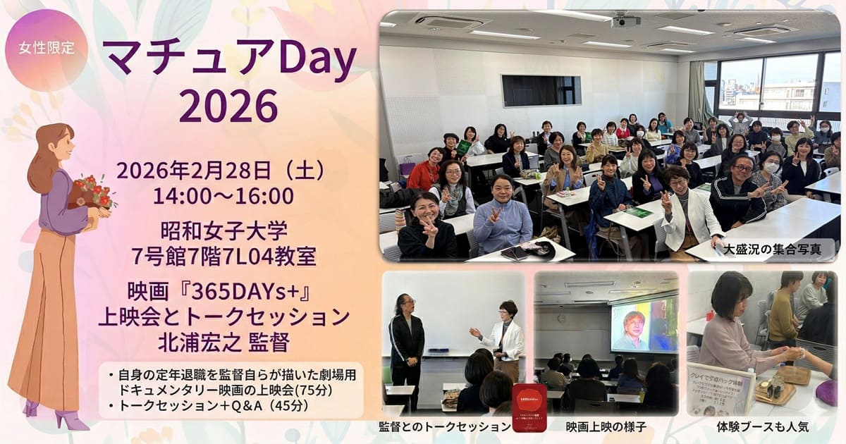 第5回マチュアDayで「定年」をテーマにしたドキュメンタリ映画を上映しました。 2026.02.28 詳細はこちら 福島県男女共生センター様で講師を担当させていただきました。 NEWS ニュース一覧 2026.02.28 第5回マチュアDayで「定年」をテーマにしたドキュメンタリ映画を上映しました。 2025.07.19 福島県男女共生センター様で講師を担当させていただきました。 2025.06.19 LINEヤフー様の運営するオンラインマガジン「サストモ」にインタビュー記事が掲載されました。 2025.06.16 朝日新聞にインタビュー記事が掲載されました。 2025.05.17 朝日新聞デジタルにインタビュー記事が掲載されました。 2025.04.11 週刊文集WOMAN 春号にインタビュー記事が掲載されました。 2025.01.31 野村證券様の50代女性に向けて、キャリアについての講演をさせていただきました。 2024.12.01 高齢者雇用の総合誌「エルダー」12月号に記事が掲載されました。 2024.11.12 女性経営幹部育成講座TAKAMIを新規開設します!